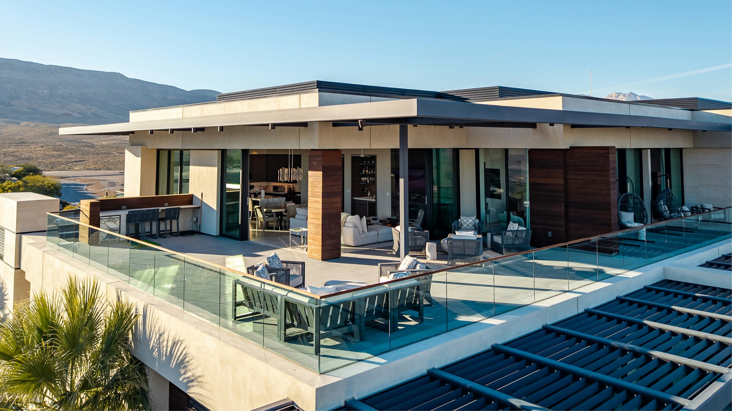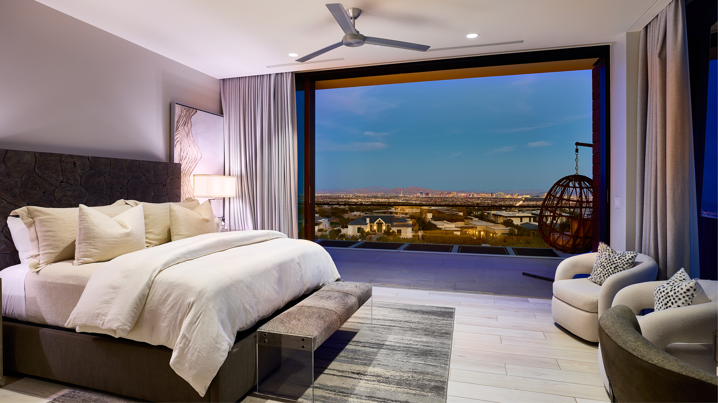 Sweeping Las Vegas Valley views lie just beyond the great room through floor-to-ceiling glass doors as you enter the residence, with an open kitchen and dining space integrated into the great room for seamless entertaining. The wrap-around terrace opens on two sides of the great room for indoor-outdoor enjoyment, with plenty of places to lounge and relax while enjoying the beautiful views.